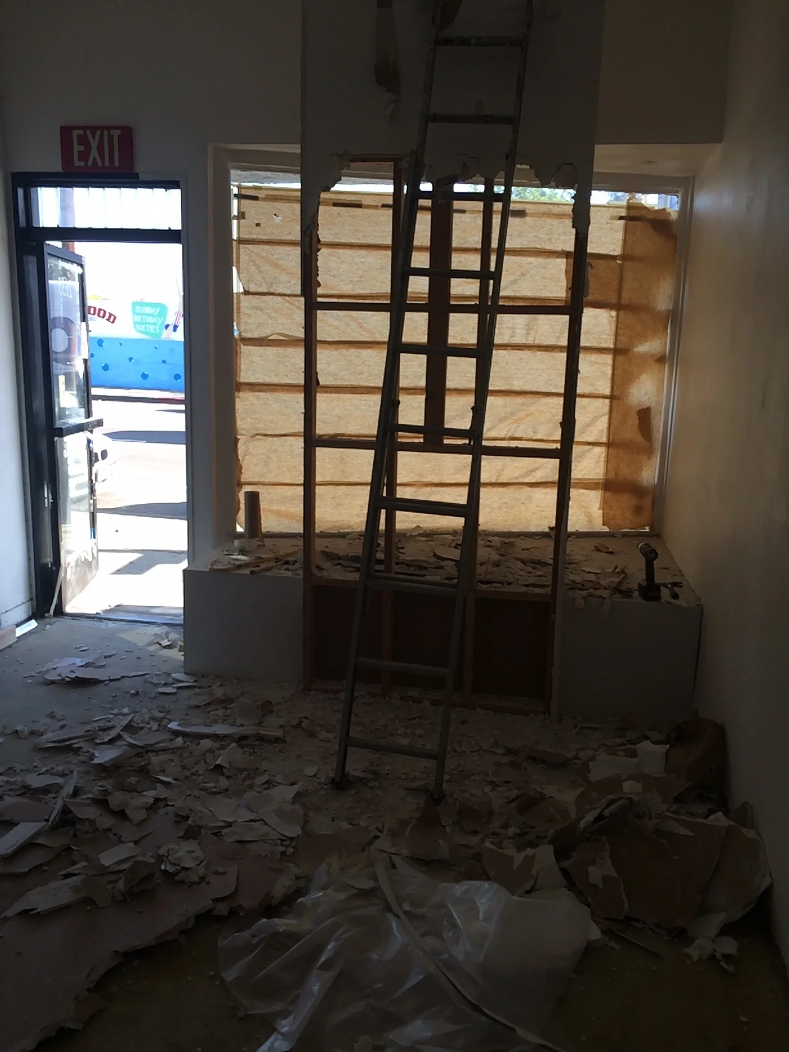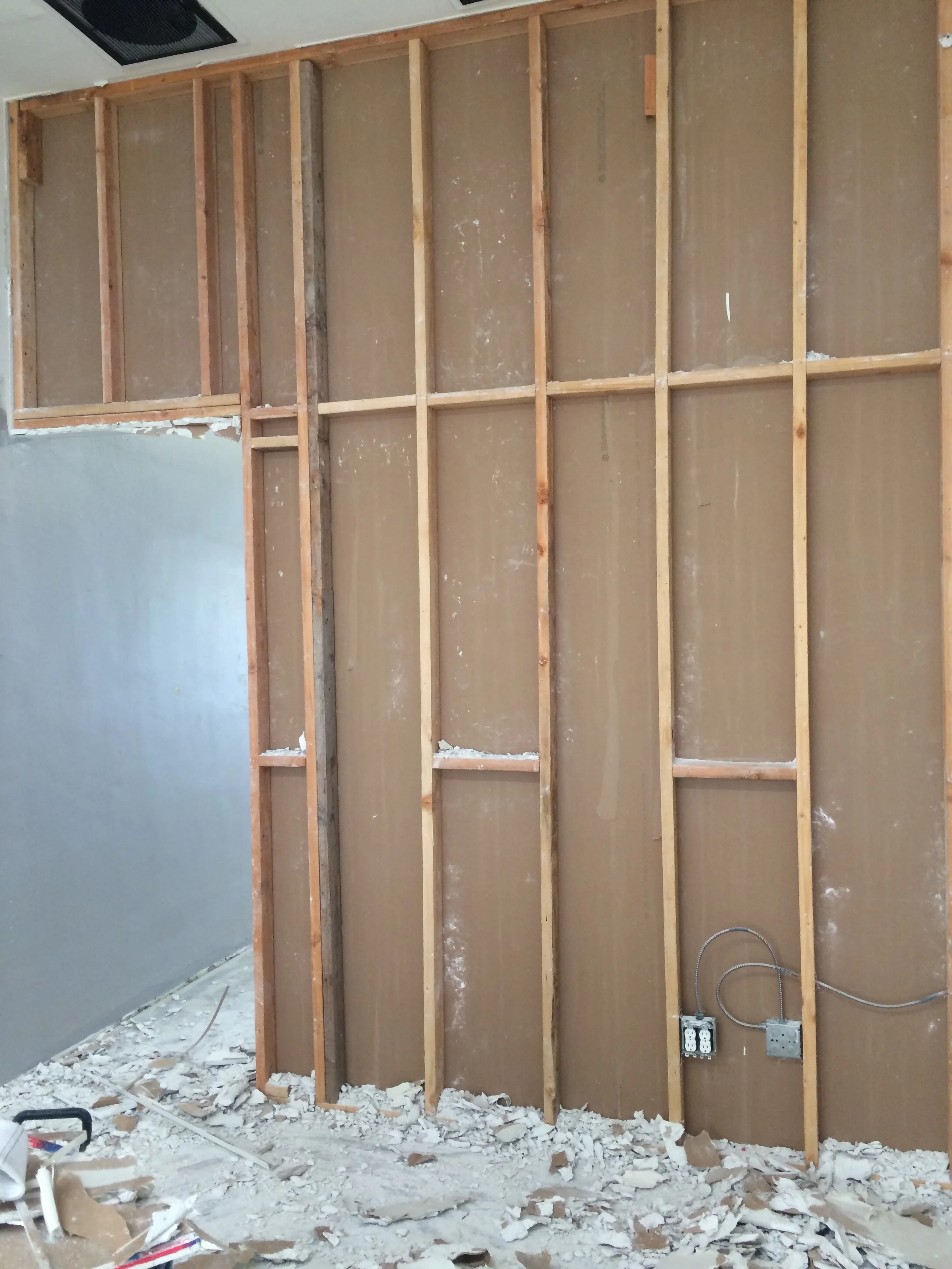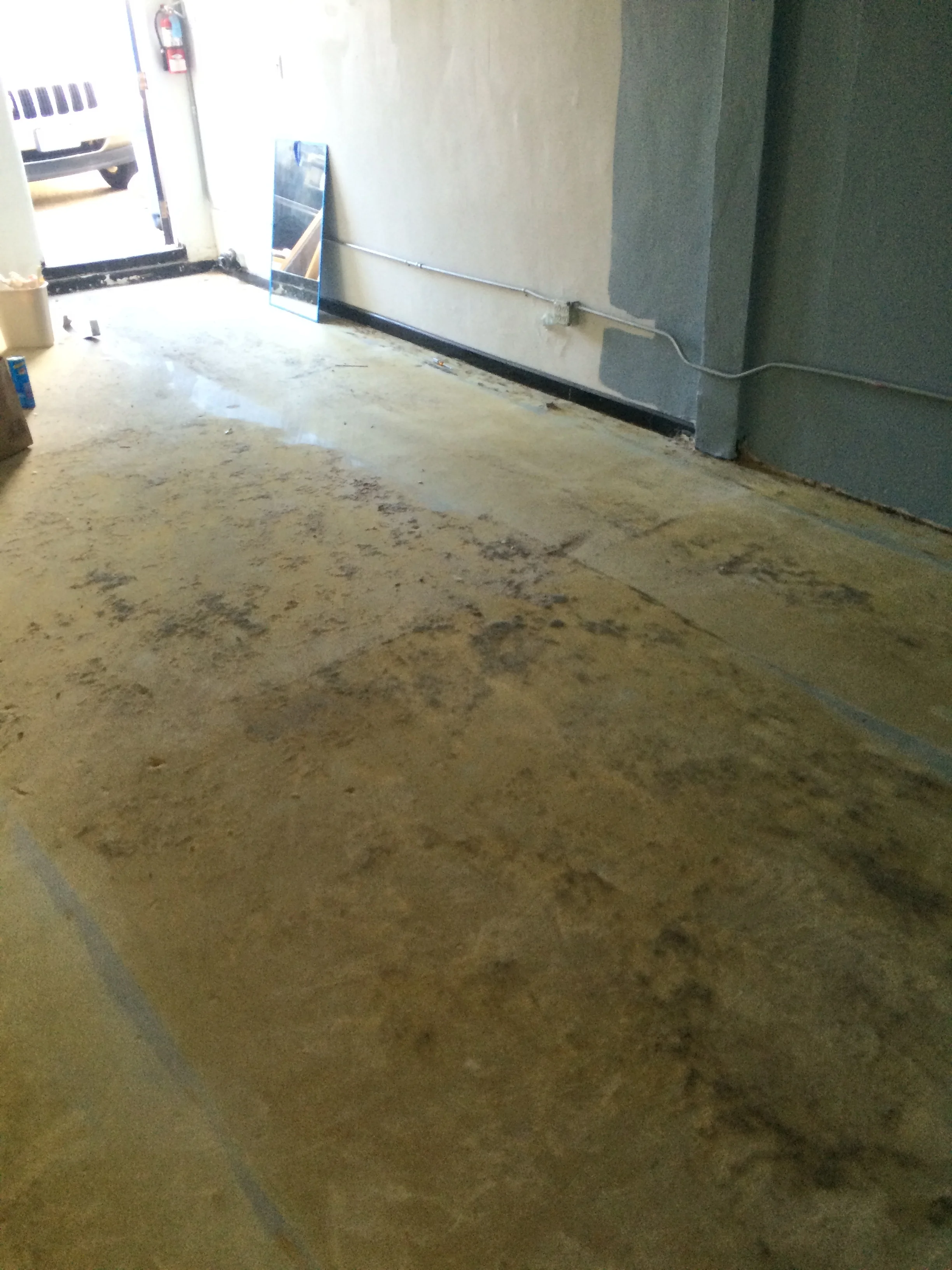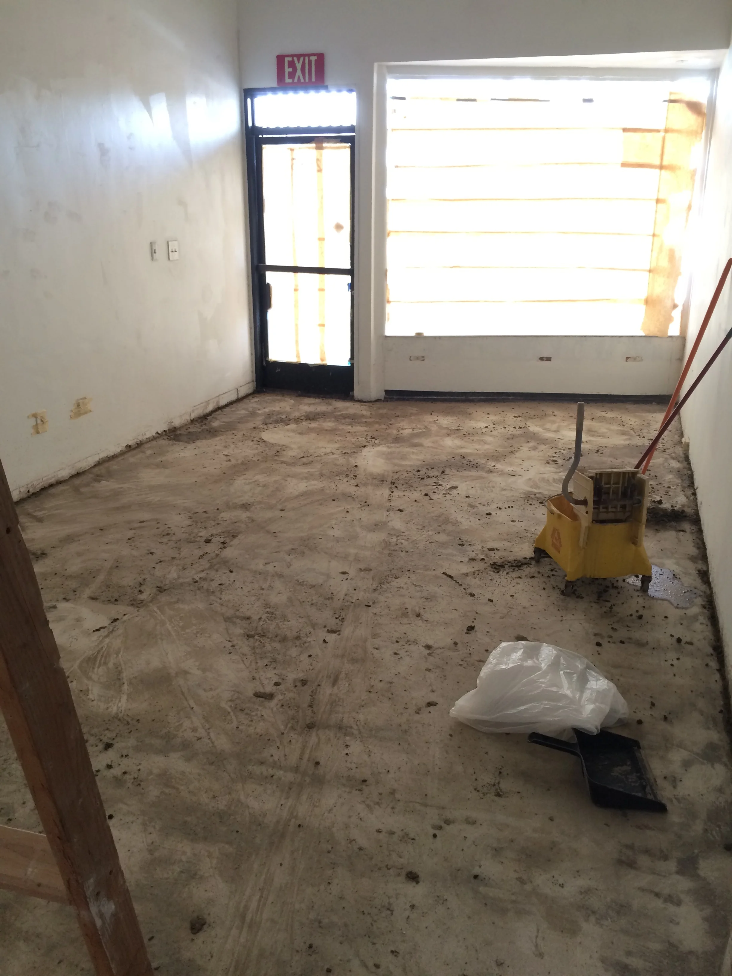 The 1st task was to get rid of that nasty old carpet and get rid of the existing wall. Easy enough right?! Turns out removing the carpet was quick and simple but getting rid of the glue that adhered the carpet to the concrete was both difficult and messy. Here's what it looked like just after we got rid of the carpet and demoed the walls.